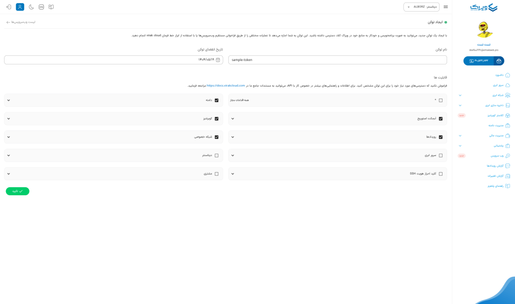 - نام، تاریخ انقضا و دسترسیهای مورد نیاز را مشخص کنید.