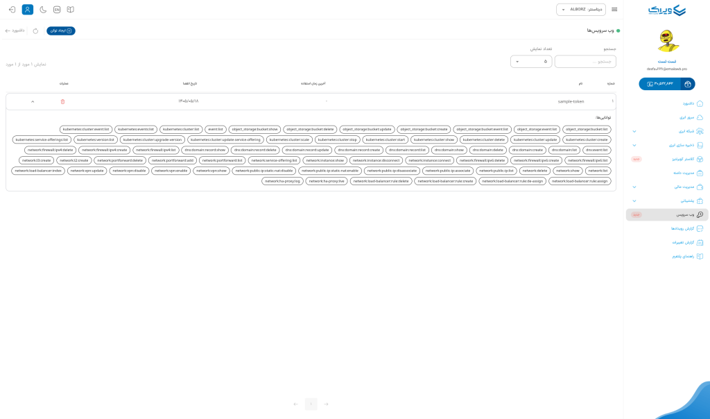 در صفحه توکنها میتوانید لیست تمام توکنهای ایجاد شده را مشاهده کنید. اطلاعات هر توکن شامل موارد زیر است: